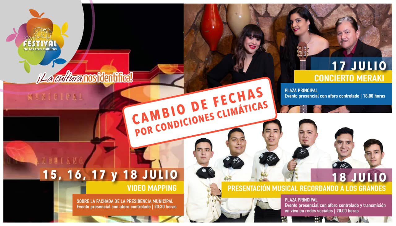 En seguimiento a recomendaciones de la Unidad de Protección Civil Municipal, se informa a la ciudadanía que los eventos al aire libre programados del 1 al 4 de Julio, se posponen para llevarse a cabo del 15 al 18 del mismo mes, en la siguiente programación: