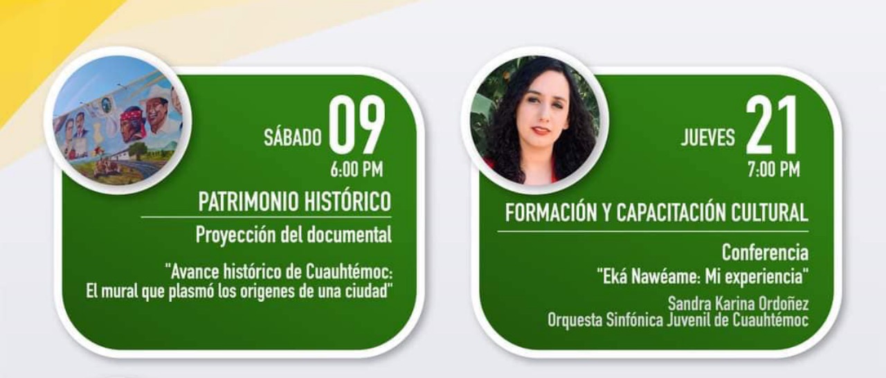 La proyección que hará el descentralizado local encabezado por Luis Fernando Armendáriz Ledezma, de un documental el sábado 09 enero, a las 6 pm, abre la cartelera mensual; posteriormente, el jueves 21 de enero, a las 7 pm, la expositora Sandra Karina Ordoñez de la Orquesta Juvenil de Cuauhtémoc presentará una conferencia de formación y capacitación cultural, denominada “Eká Nawéame: Mi Experiencia”.