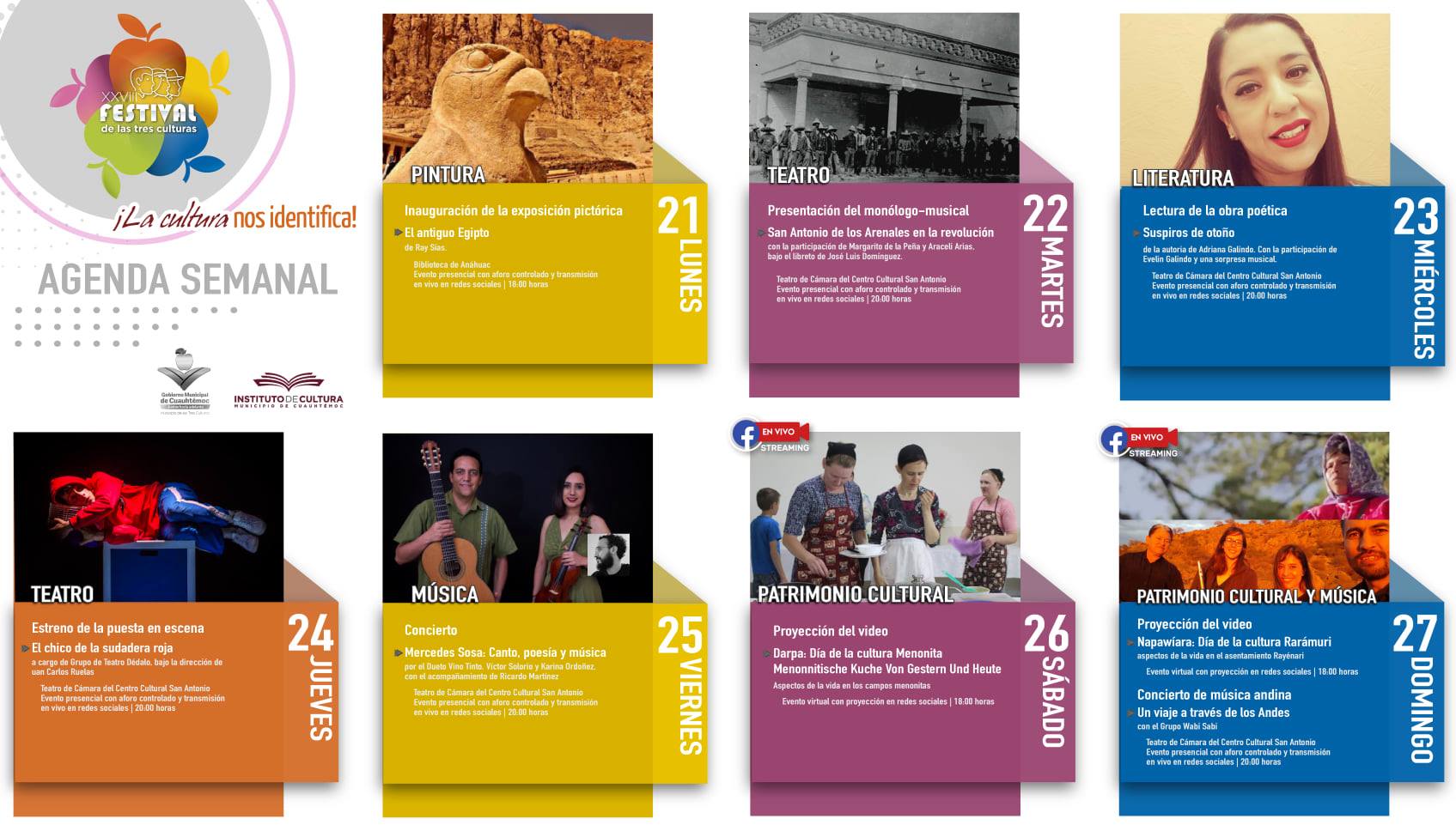 Tenemos una semana muy nutrida en actividad, comenzando con una exposición pictórica en Anáhuac; regresamos con mucha actividad en la cabecera municipal, con teatro-monólogo musical, lectura de obra poética, teatro experimental, muy buena música y dos materiales audiovisuales de corte documental acerca de dos de nuestras culturas.