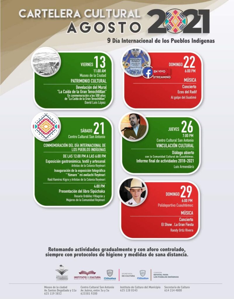 La cartelera la complementan actividades como la develación del Mural “La Caída de la Gran Tenochtitlan” en conmemoración a los 500 años del evento histórico, la cual será en el Museo de Historia Regional el próximo viernes 13 de agosto a las 11 am. También el jueves 26 de agosto, el director del Instituto, Luis Fernando Armendáriz sostendrá un diálogo abierto con la comunidad cultural sobre el informe de actividades 2018-2021.