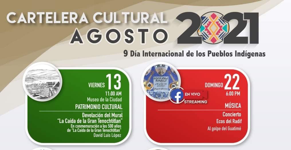 La cartelera la complementan actividades como la develación del Mural “La Caída de la Gran Tenochtitlan” en conmemoración a los 500 años del evento histórico, la cual será en el Museo de Historia Regional el próximo viernes 13 de agosto a las 11 am. También el jueves 26 de agosto, el director del Instituto, Luis Fernando Armendáriz sostendrá un diálogo abierto con la comunidad cultural sobre el informe de actividades 2018-2021.