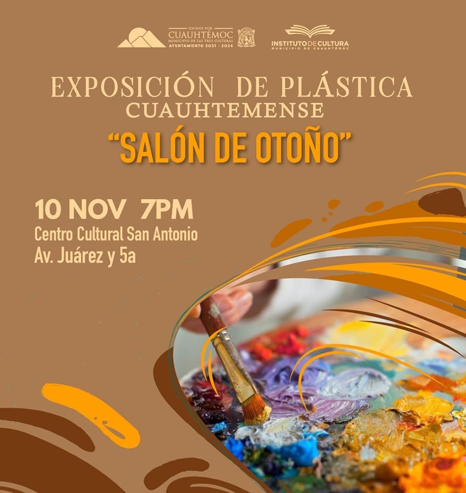 Cd. Cuauhtémoc, Chih.- El Instituto de Cultura del Municipio invita a la exposición de plástica cuauhtemense “Salón de otoño”, este jueves 10 de noviembre, a las 19:00 horas, en el Centro Cultural San Antonio (Teatro de Cámara), en la avenida Juárez y Quinta.