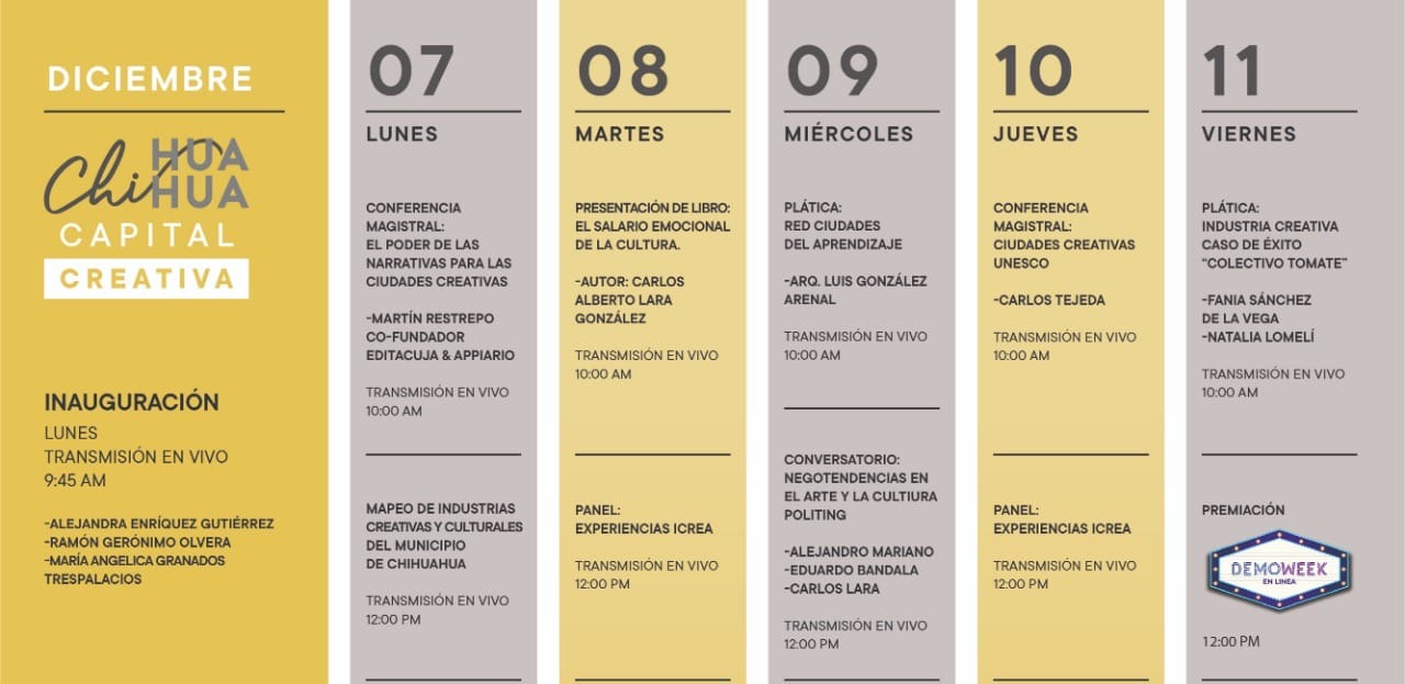 El Gobierno Municipal de Chihuahua invita a la comunidad a no perderse la semana “Chihuahua Capital Creativa”, evento organizado por el Instituto de Cultura del Municipio (ICM) y la Dirección de Desarrollo Económico y Turístico, en colaboración con el Centro de Innovación y Emprendimiento Tecnológico de la Universidad Autónoma de Chihuahua, que se llevará a cabo del 7 al 11 de diciembre a través del Facebook.com/ICMchihuahua.