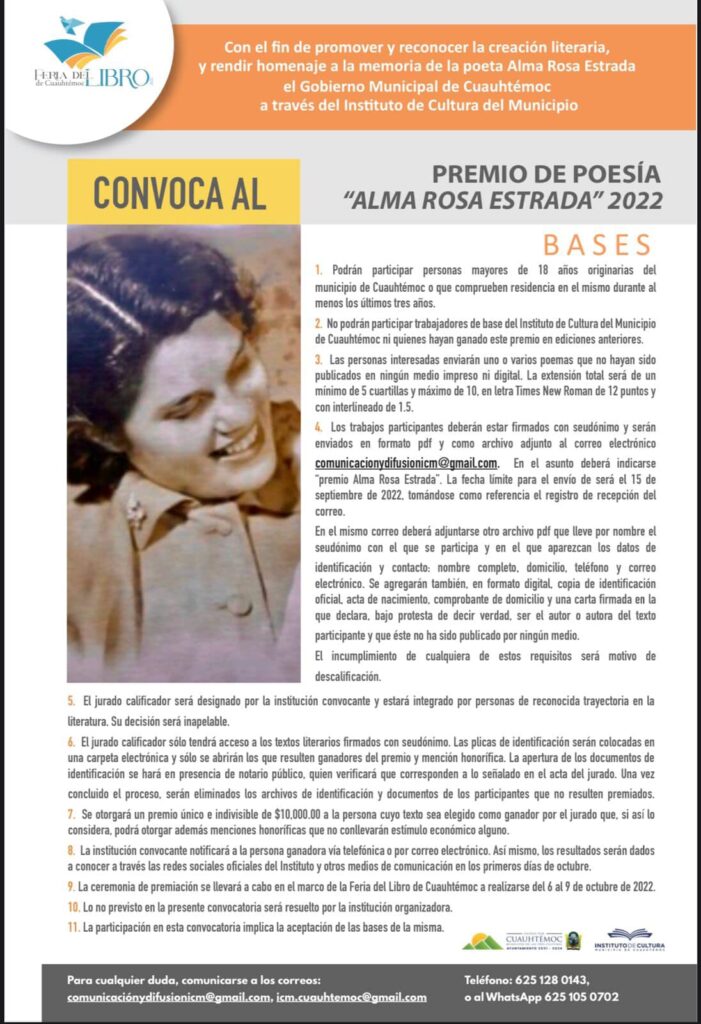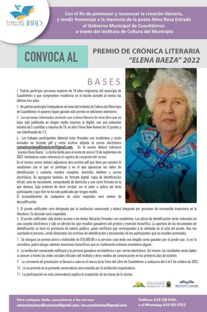 El Premio de Crónica Literaria Elena Baeza Herrera y el Premio de Poesía Alma Rosa Estrada. En los cuales, podrán participar personas mayores de 18 años originarias del municipio de Cuauhtémoc o que comprueben residencia en el mismo durante al menos los últimos tres años. La selección del texto ganador, así como de las menciones honoríficas será a través de un seudónimo, y por un jurado calificador experto en el tema.
