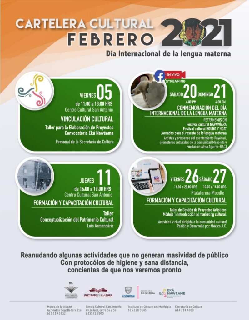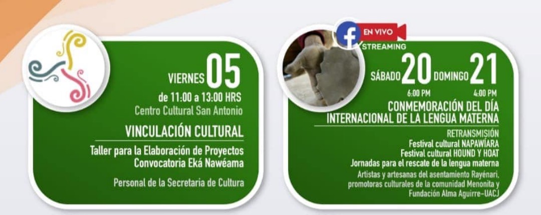 Previo a ello, el sábado 20 y domingo 21 de febrero, de manera virtual y a través de la página oficial de Facebook del Instituto de Cultura del Municipio de Cuauhtémoc se retransmitirá el Festival Cultural Napawìara, así como el Festival Cultural Hound y Hoat, y las Jornadas Para el Rescate de la Lengua Materna, como parte de la conmemoración del Día Internacional de Lengua Materna.