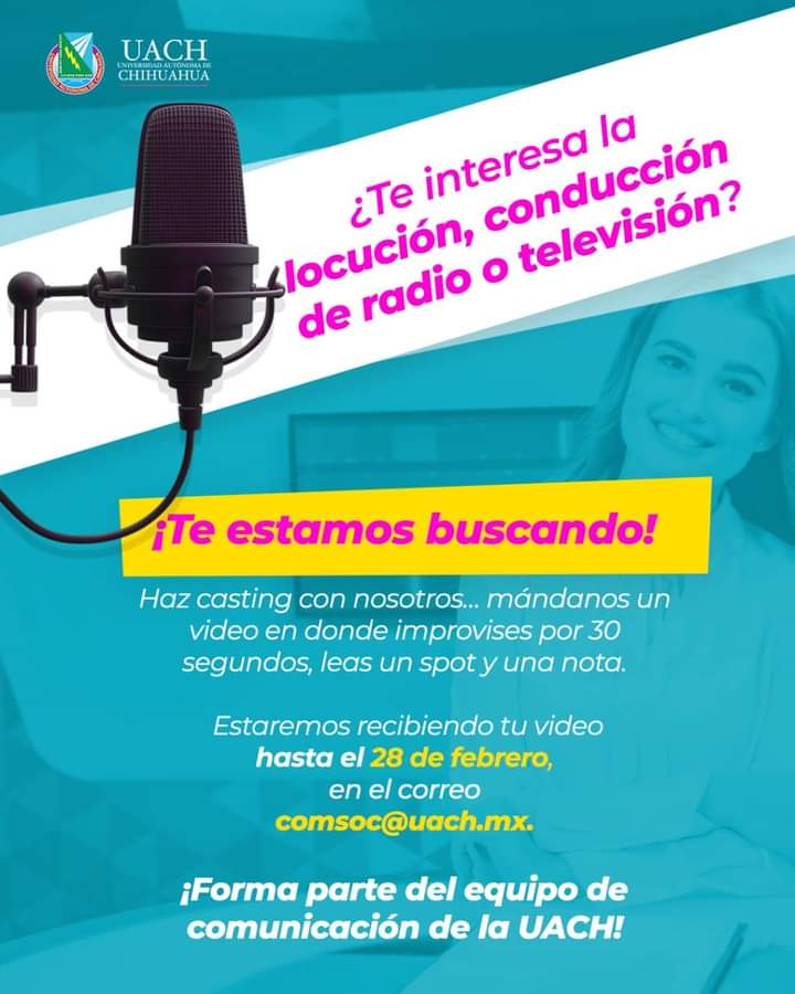 El casting está abierto del 01 al 28 de febrero, las personas interesadas deberán realizar un video con un acto de improvisación en el que por 30 segundos den lectura a una nota y/o spot de radio. El video será enviado al correo electrónico comsoc@uach.mx