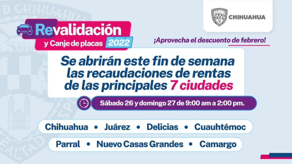 La Secretaría de Hacienda informó que los días sábado 26 y domingo 27 de febrero del presente se abrirán las siete principales recaudaciones de rentas de la entidad, ubicadas en las ciudades de Chihuahua, Juárez, Delicias, Cuauhtémoc, Parral, Nuevo Casas Grandes y Camargo, en apoyo a los contribuyentes por cierre de incentivos, del mes de febrero, para el pago de canje de placas y revalidación vehicular 2022.