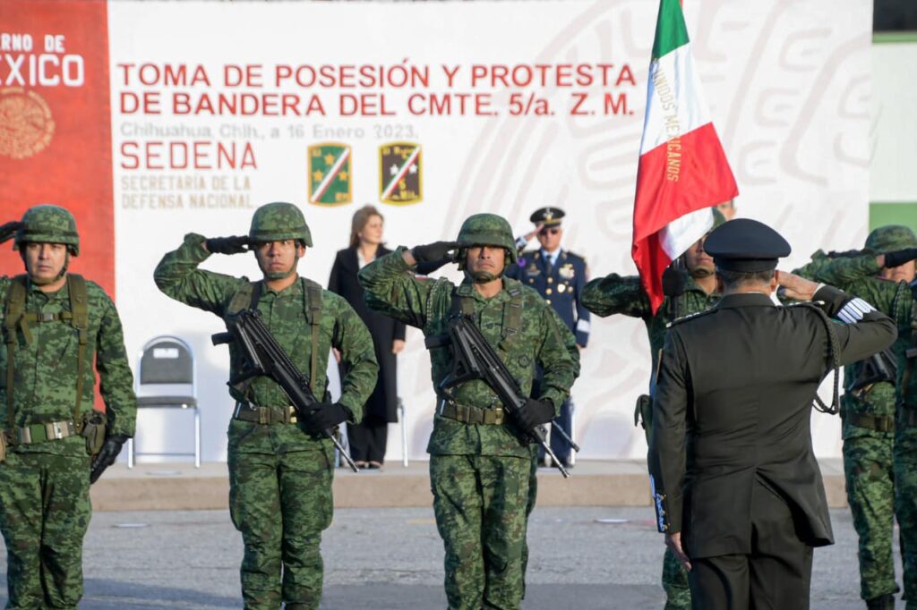 La Gobernadora Maru Campos acudió como invitada de honor a la ceremonia de toma de posesión y protesta de Bandera al nuevo comandante de la Quinta Zona Militar, el General de Brigada Diplomado de Estado Mayor, Saúl Luna Jaimes.
