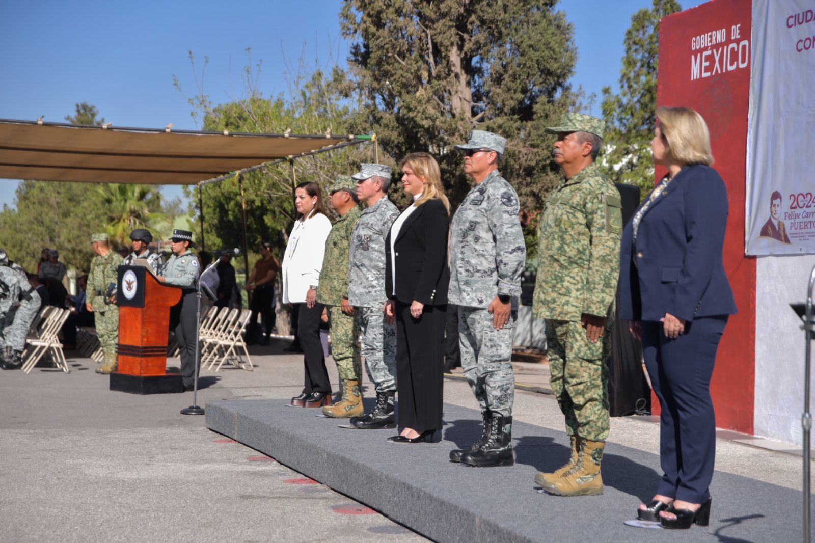 Además de la titular del Ejecutivo, también asistieron al evento las presidentas del Tribunal Superior de Justicia y del Congreso del Estado, los comisarios de las zonas militares 42ª y 5ª, y el titular de la Unidad de Órganos Especializados por competencia de la Guardia Nacional.