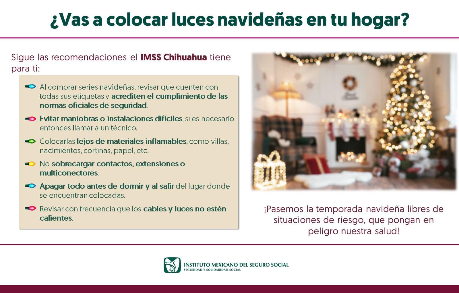 El Instituto Mexicano del Seguro Social (IMSS) en Chihuahua pide a la población extremar precauciones en la compra, instalación y el uso de series con luces durante la temporada navideña.