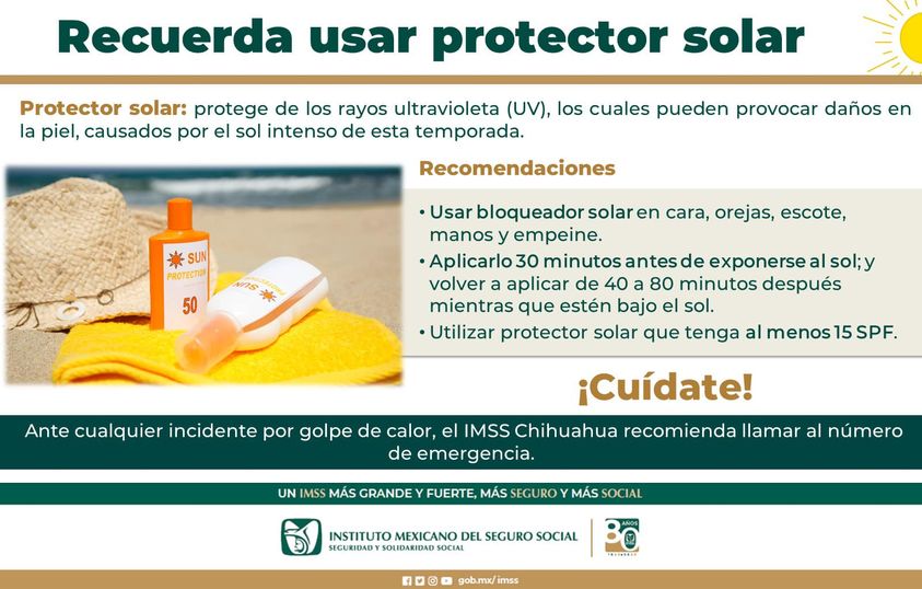 El Instituto Mexicano del Seguro Social (IMSS) en Chihuahua advierte que la exposición prolongada a los rayos del sol y sin protector solar, puede causar quemaduras de primer, segundo y hasta tercer grado.