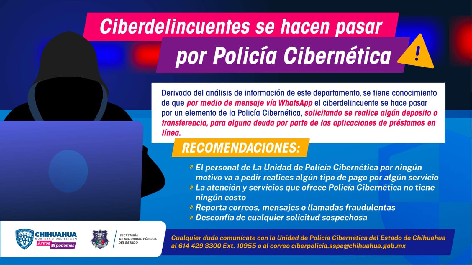 La Policía Cibernética recomendó reportar 614-429-33-00 en la extensión 10955 o al correo ciberpolicia.sspe@chihuahua.gob.mx correos, mensajes o llamadas en las que se solicite dinero a cambio de un servicio.