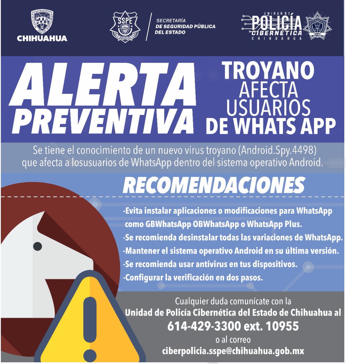 Derivado de los análisis de la Dirección de Policía Cibernética de la Secretaría de Seguridad Pública del Estado (SSPE), se detectó un virus troyano que afecta el programa de mensajería Whatsapp.
