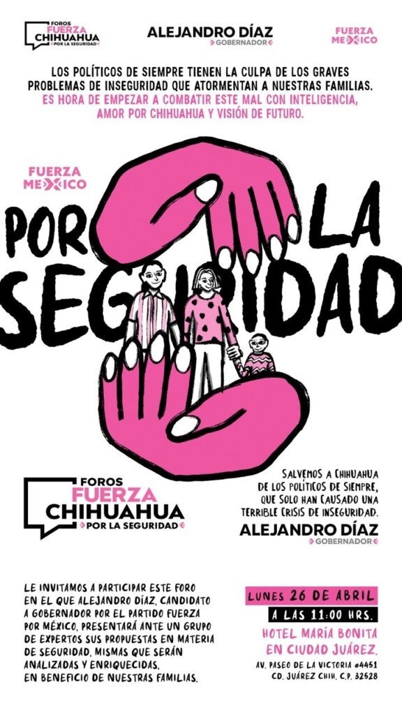 El Foro Fuerza Chihuahua por la Seguridad se realizará este lunes 26 de abril a las 11:00 horas en Ciudad Juárez, donde Alejandro Díaz presentará ante un grupo de expertos sus propuestas en materia de seguridad, mismas que serán analizadas y enriquecidas por los participantes en beneficio de nuestras familias.