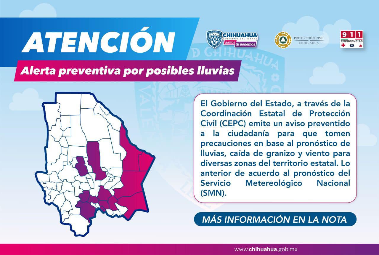 El Gobierno del Estado, a través de la Coordinación Estatal de Protección Civil (CEPC) emite un aviso preventivo para que, la ciudadanía tome las previsiones correspondientes, con base al pronóstico de lluvias y viento para estos próximos días en algunas zonas del territorio estatal.