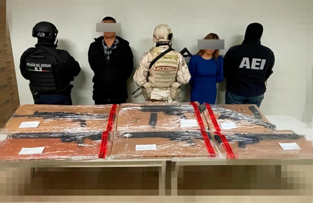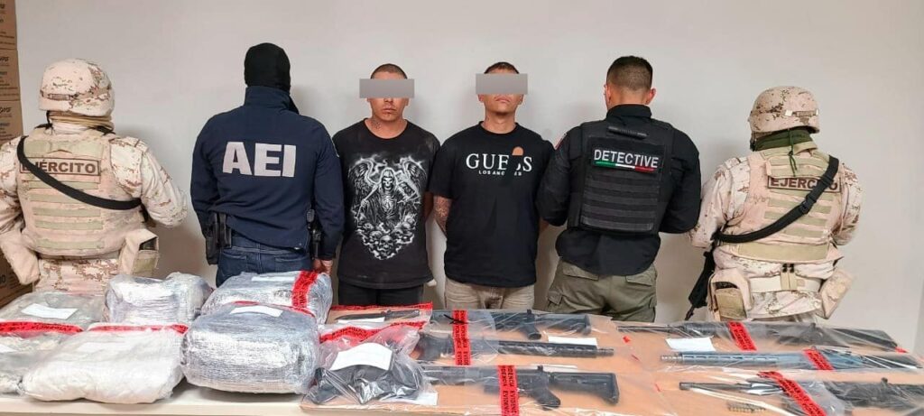 Mientras que en las calles Región de san Querétaro esquina con Región de Oregón del Fraccionamiento Regiones de san Carlos, se logra la detención de Josuan David J. B., alias “El 50 y/o Lokillo”, de 25 años, y Araceli Debora C., alias “La chikis” de 24 años, los cuales se encontraban a bordo de un vehículo de la marca BMW color gris sin matrícula de circulación, traían consigo -6 armas largas, calibre .223 – 1 cargador de plástico abastecidos con 10 cartuchos útiles -1 cargador metálico abastecidos con 10 cartuchos útiles