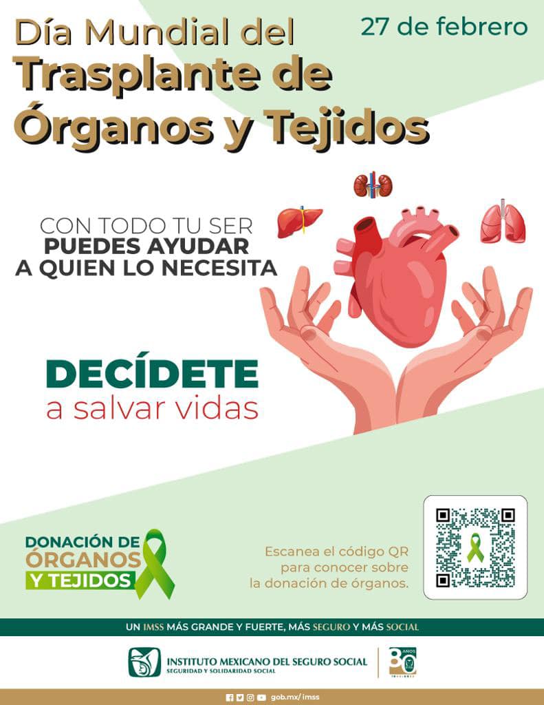 En el marco del Día Mundial del Trasplante de Órganos y Tejidos, a celebrarse este 27 de febrero, el Instituto Mexicano de Seguro Social (IMSS) en Chihuahua llama a la reflexión de esta importante acción, tras destacar que su objetivo es “dar vida después de la vida”.