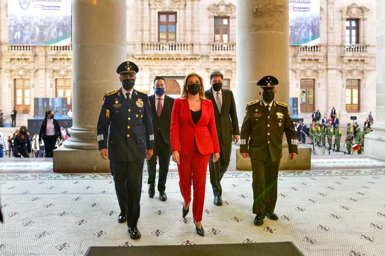 En la ofrenda cívica acompañaron a la titular del Ejecutivo; Javier González Mocken, Secretario de Educación y Deporte; el presidente municipal de Chihuahua, Marco Bonilla; Pablo González, presidente del Tribunal Superior de Justicia del Estado; Mario Vázquez, presidente del Congreso del Estado; Federico Solorzano comandante de la 5/a Zona Militar y Bertín Hernández, omandante de la Región Aérea del Noreste.