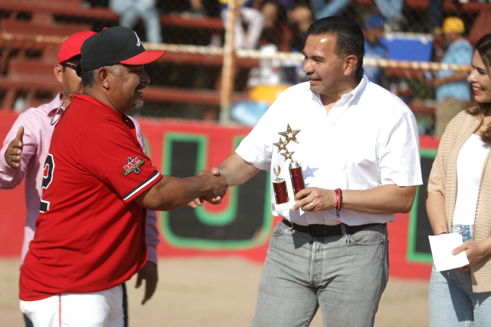 El alcalde, acompañado por su esposa , Rubí Enríquez, acudió al Juego de Estrellas en el “Estadio Chon Puebla” en San Isidro para participar en la entrega de reconocimientos a los mejores peloteros de esta zona.