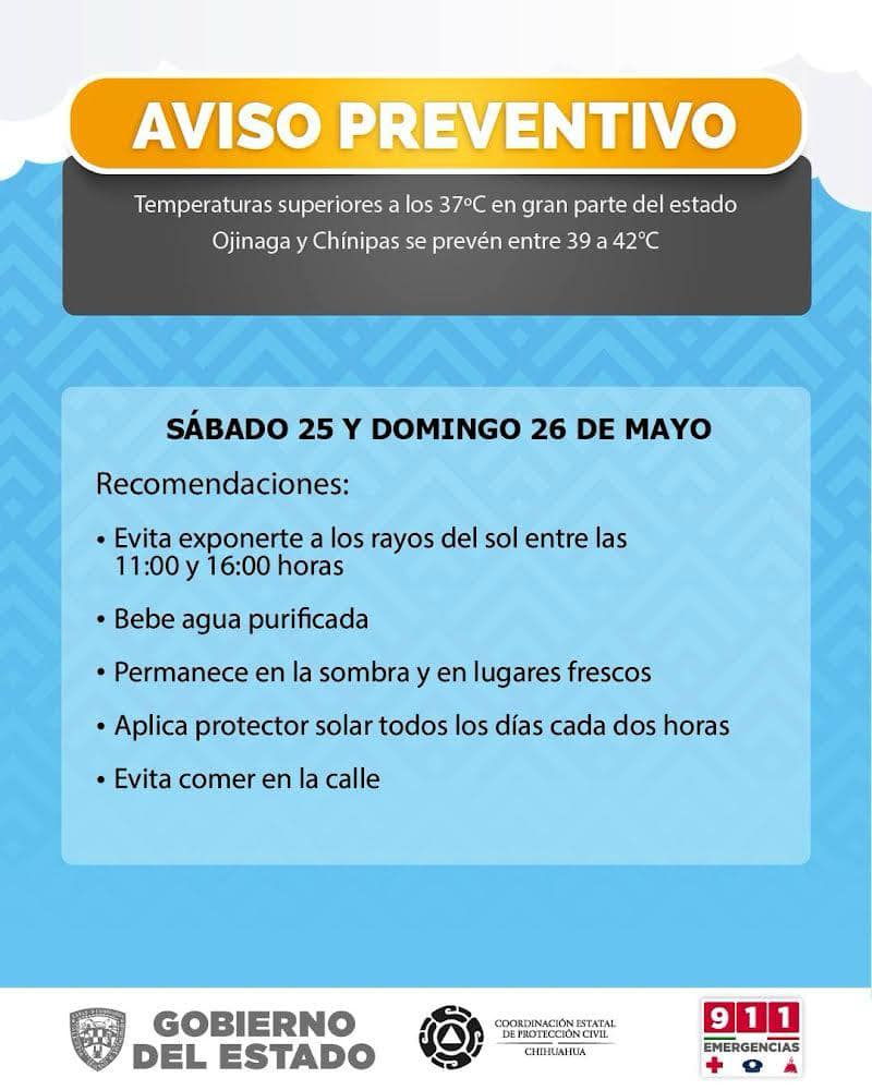 Las temperaturas esperadas para ese día son (máx/min °C): Chihuahua 37, Juárez 35, Janos 33, Madera 27, Temósachic 29, Cuauhtémoc 31, Ojinaga 40, Delicias 39, Camargo 39, Jiménez 38, Parral 36, Creel 26, Chínipas 41, Guachochi 26 y El Vergel 25.