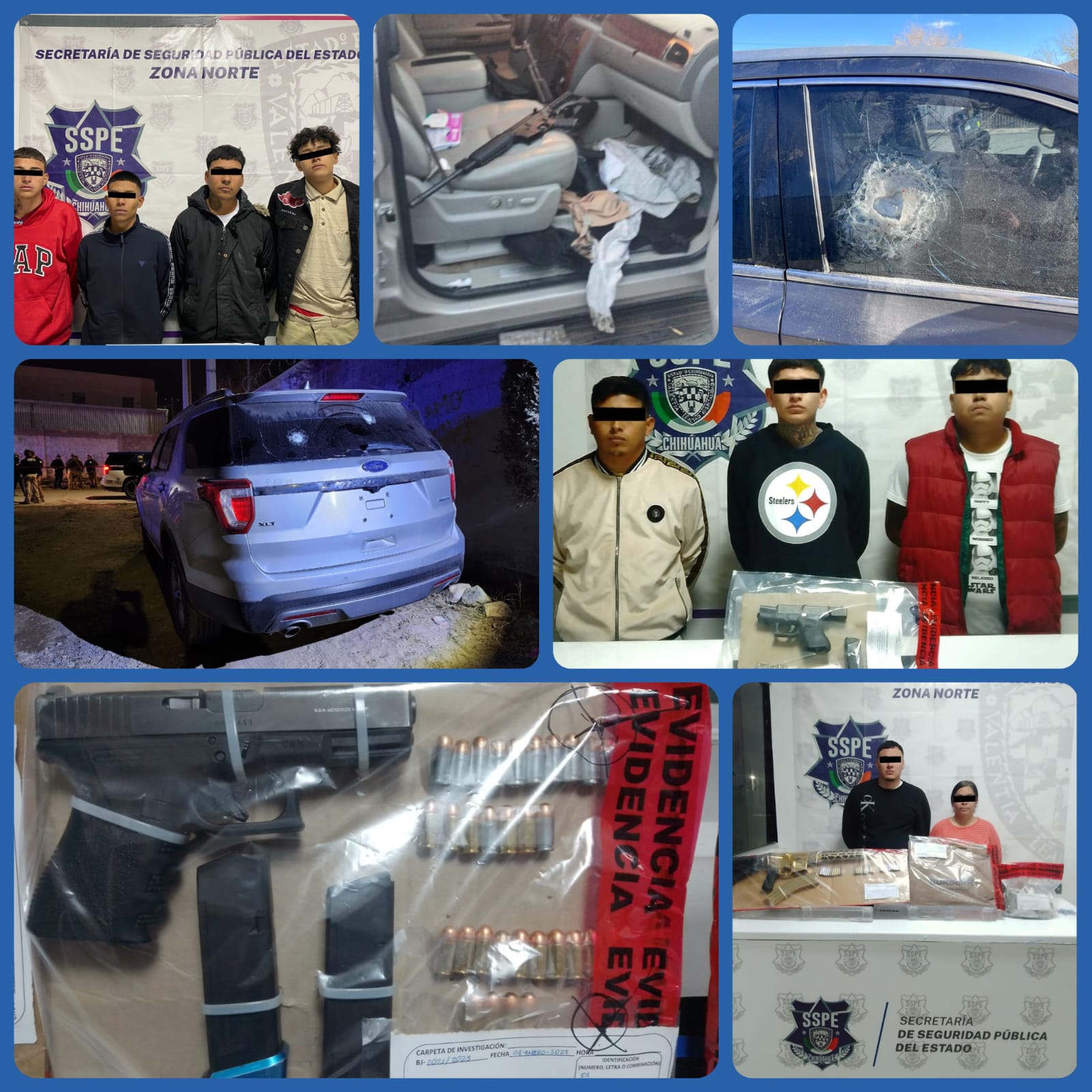 Del primero al 5 de enero del 2023, durante el despliegue operativo de la Secretaría de Seguridad Pública del Estado (SSPE) en Ciudad Juárez, se abatieron a 5 delincuentes, fueron detenidas 35 personas, asegurados 10 vehículos entre ellos 3 blindados y 19 armas de fuego, así como cargadores, cartuchos y diverso equipo táctico.