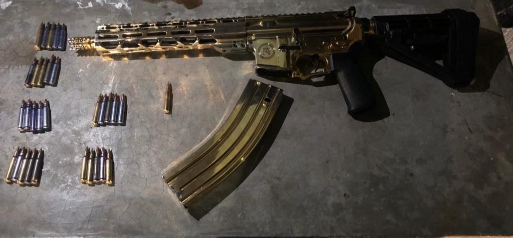 Fueron aseguradas 19 armas de diversos calibres, entre ellas una con chapa de oro, así como cargadores para las mismas, más de 100 municiones de varios calibres, chalecos tácticos antibalas y diverso equipo táctico.