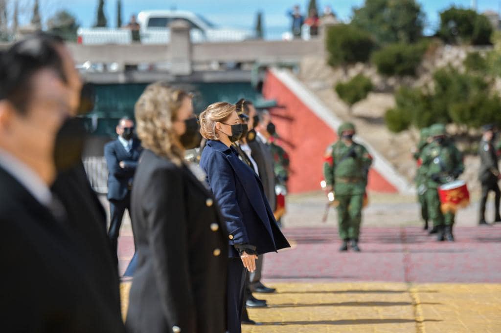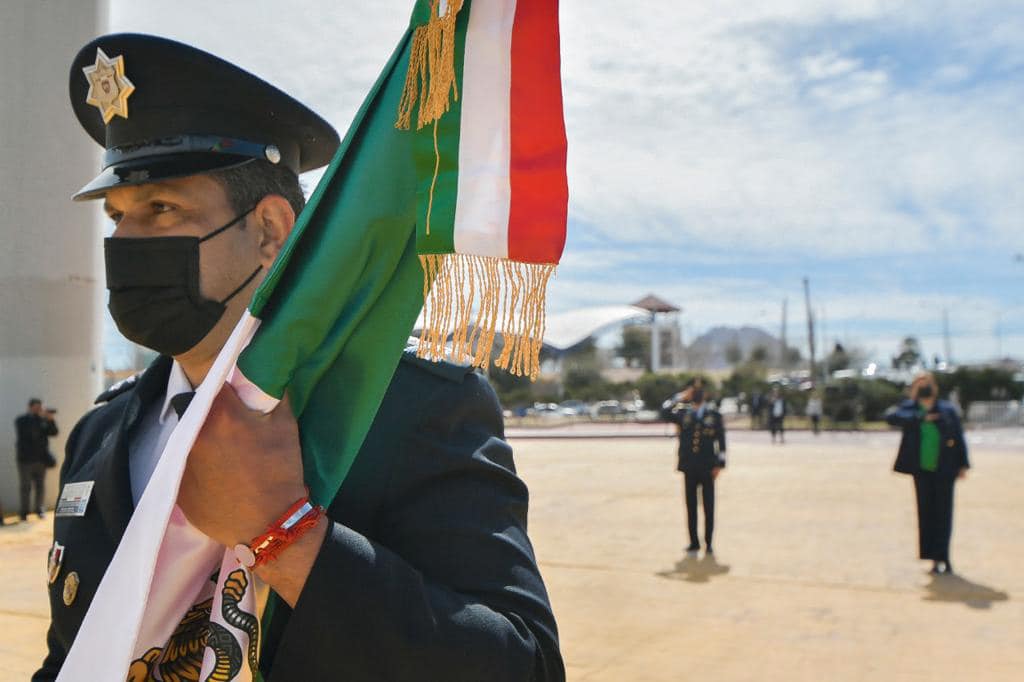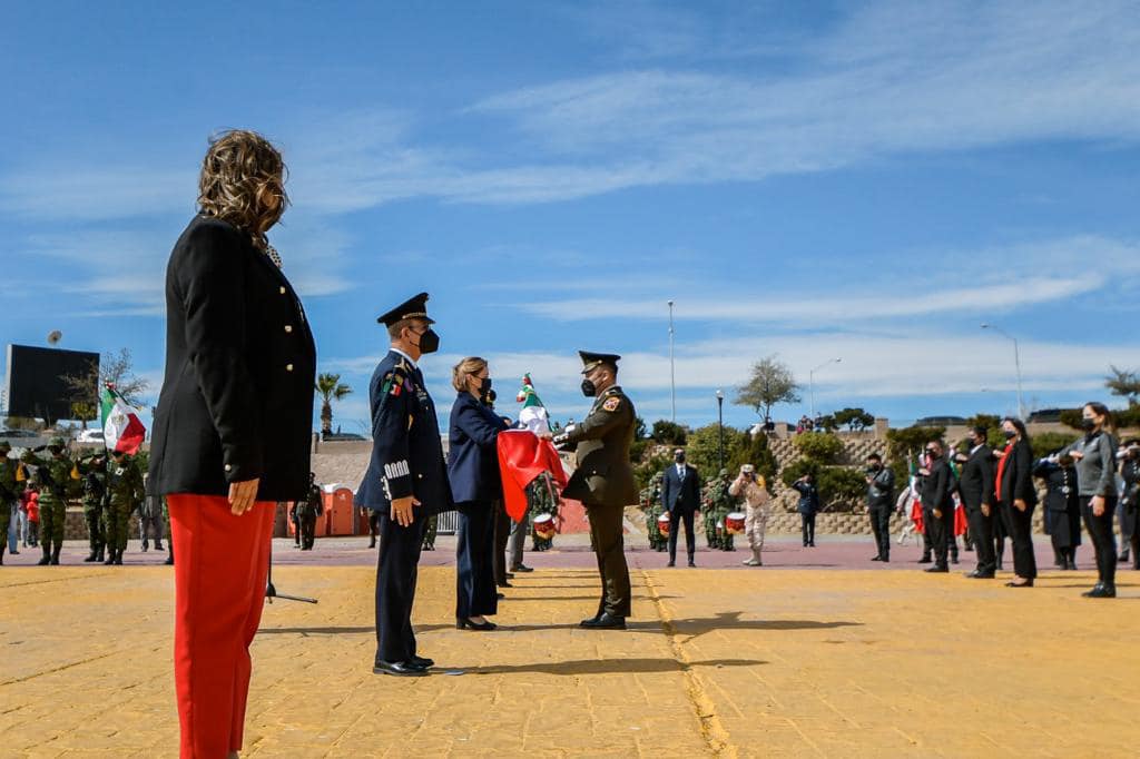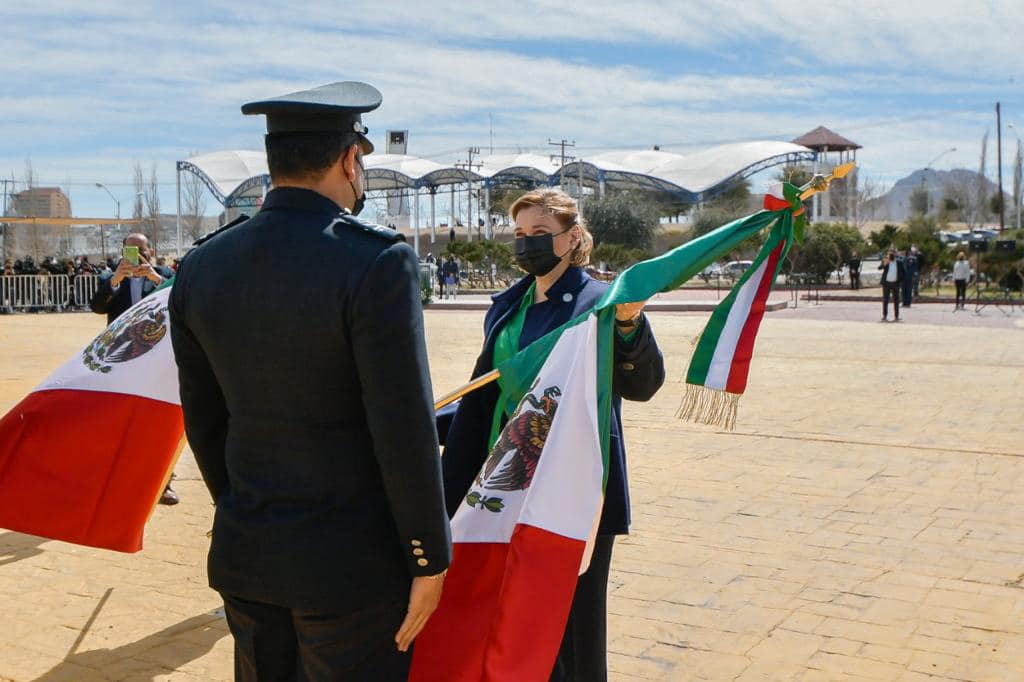 Acompañada por el presidente municipal de Chihuahua, la Gobernadora abanderó a las escoltas de la Policía Estatal, Dirección de Seguridad Pública Municipal, de cinco instituciones de nivel medio superior que son Plantel 2 del Colegio de Bachilleres (Cobach), Plantel 8 del Cobach, CBTis 122 Riberas Chihuahua, CECyT 21 y Preparatoria Estatal 8421 Maestros Mexicanos.
