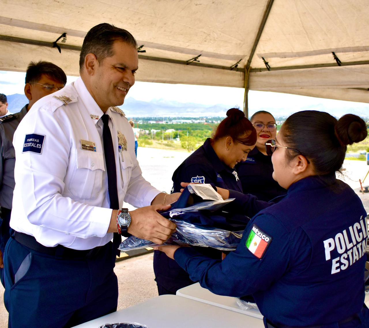 El Secretario de Seguridad Pública del Estado, Gilberto Loya, encabezó la entrega simbólica de uniformes dirigidos al personal de la Policía de Despliegue, así como a elementos de Movilidad del Estado.