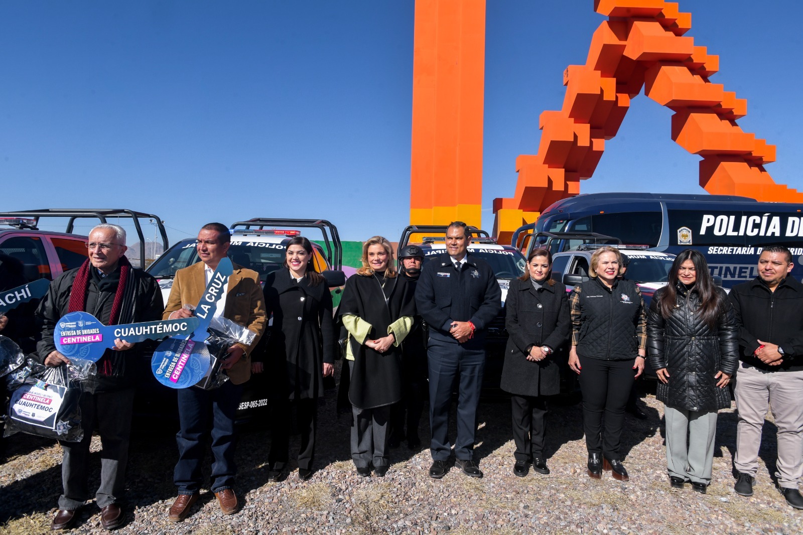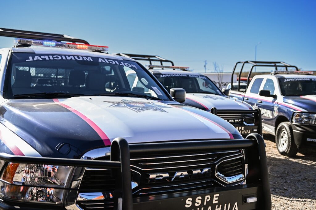 Durante una ceremonia que se desarrolló en las inmediaciones de la Puerta de Chihuahua, la mandataria estatal distribuyó además 1,368 chamarras, que formarán parte del uniforme de elementos de 50 corporaciones municipales de seguridad pública.