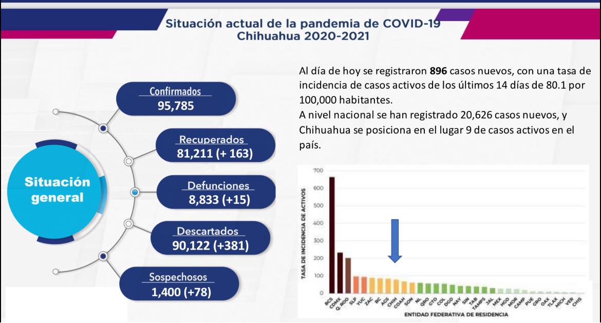 Además se reporta una tasa de incidencia de casos activos de los últimos 14 días de 80.1 por 100 mil habitantes y a nivel nacional se han registrado 20,696 casos nuevos, de forma que Chihuahua se posiciona en el lugar 9 de casos activos en el país, la cantidad de casos en la entidad ha ido en aumento al igual que en otros estados.