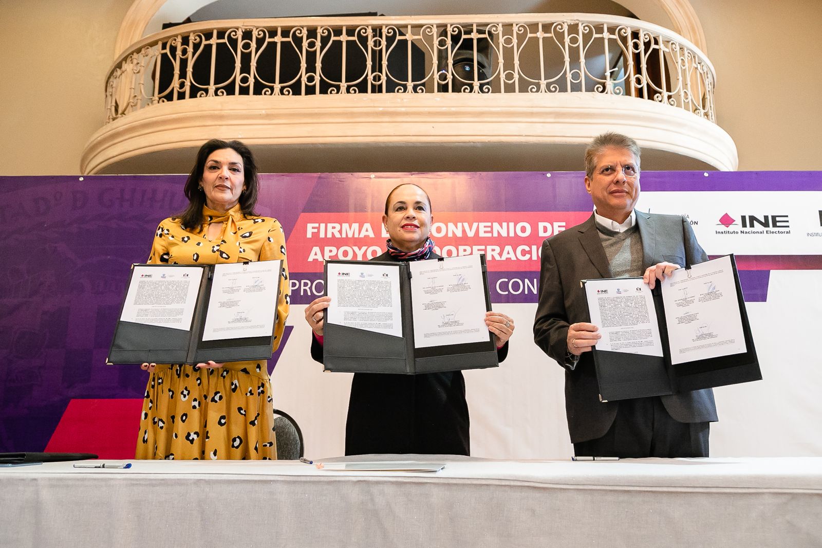 La Secretaría de Educación y Deporte (SEyD) firmó un convenio de colaboración con el Instituto Nacional Electoral (INE) y el Instituto Estatal Electoral de Chihuahua (IEE), para la utilización de 2 mil 120 planteles educativos en el Proceso Electoral Concurrente 2023-2024.