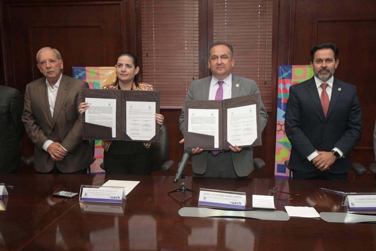 Con la finalidad de contribuir con la comunidad chihuahuense, el rector de la Universidad Autónoma de Chihuahua, Luis Alfonso Rivera Campos y la presidenta del Tribunal Superior de Justicia de Chihuahua, Myriam Victoria Hernández Acosta celebraron la firma de un convenio en el que la UACH cede espacios que se encuentran sin utilizar al poder judicial.
