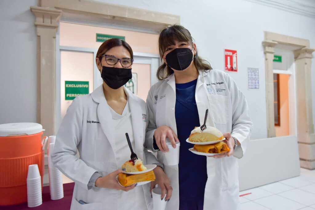 En el pasillo principal del inmueble, la Gobernadora fue la primera en partir el simbólico alimento, acompañada por el secretario de Salud, Felipe Fernando Sandoval y la directora del nosocomio, Eréndira Martínez Anchondo.
