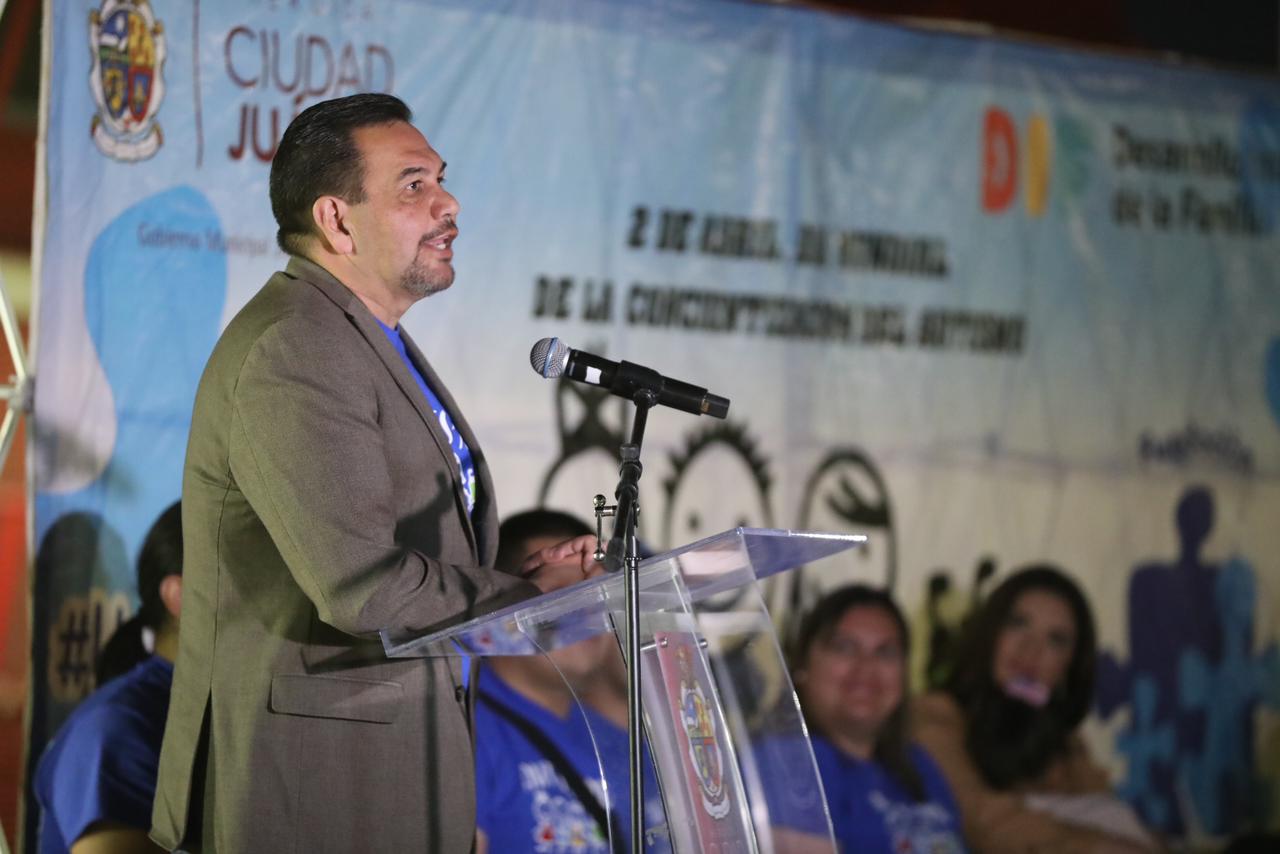 Cd. Juárez, Chih.-El presidente municipal, Cruz Pérez Cuéllar, acompañado por Rubí Enríquez, presidenta del Sistema para el Desarrollo Integral de la Familia del municipio de Juárez (DIF), encendieron esta noche el monumento de la “X” de color azul para conmemorar el Día Mundial de Concienciación sobre el Autismo.