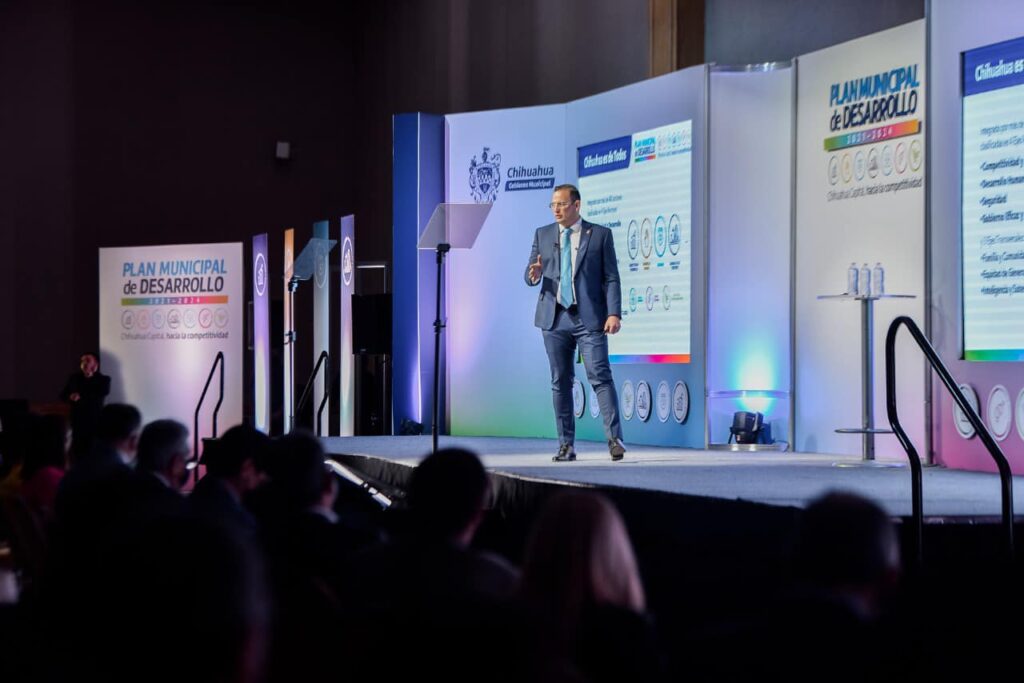 Durante la presentación del Plan Municipal de Desarrollo de la ciudad de Chihuahua, el Alcalde presentó las líneas de acción en las que se basará su administración para los próximos 3 años en el municipio de Chihuahua a través de los ejes prioritarios; Competitividad, Desarrollo Humano, Seguridad y Gobierno Eficaz y Eficiente.