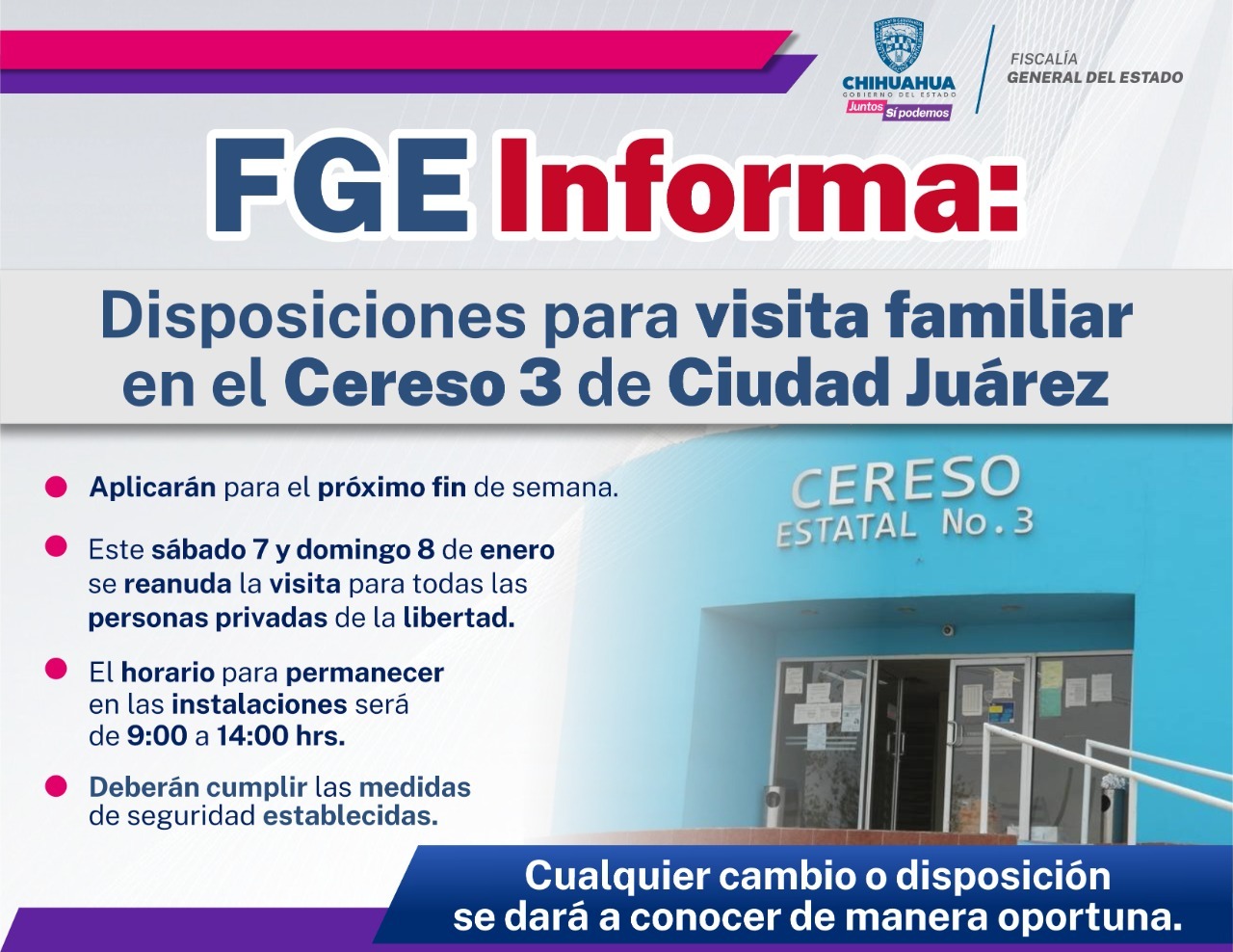 La Fiscalía General del Estado dio a conocer que el sábado 7 y domingo 8 de enero, la visita familiar en el Centro de Reinserción Social número tres, se reanudará para las personas privadas de la libertad que se encuentran en internamiento en todas las áreas de este penal.