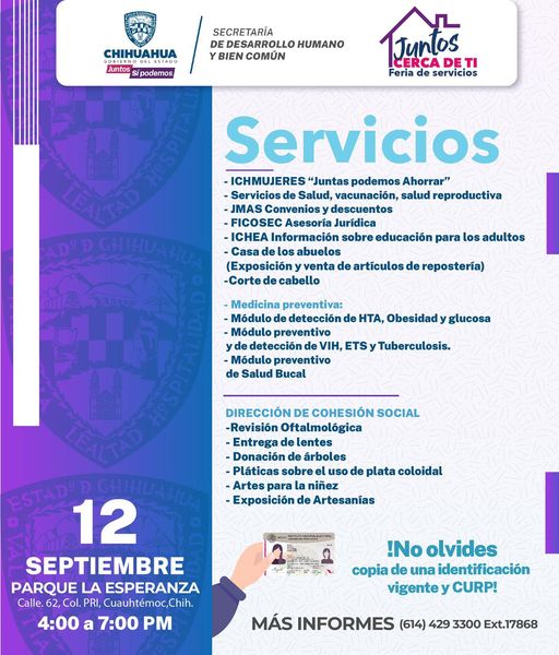 Con el propósito de acercar los servicios que brinda el Gobierno del Estado a la ciudadanía, la Secretaría de Desarrollo Humano y Bien Común (SDHyBC) invita a aprovechar la feria de servicios “Juntos Cerca de Ti”, que se llevará a cabo el próximo martes 12 de septiembre en ciudad Cuauhtémoc.