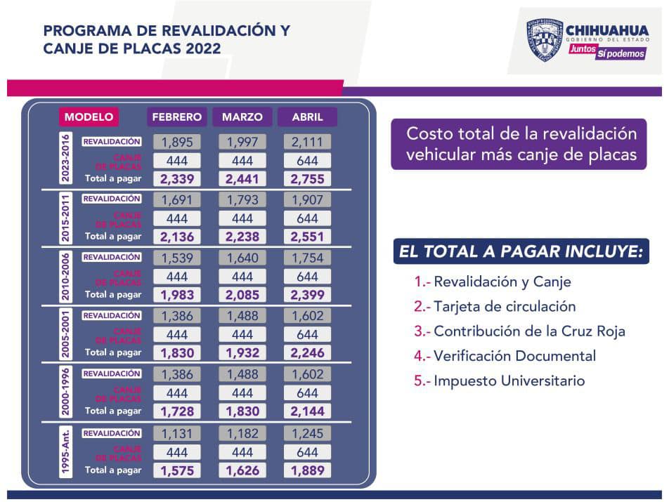 Con el objetivo de actualizar el padrón vehicular y brindar mayor certeza a los chihuahuenses en materia de seguridad y reactivación económica, el Gobierno del Estado, dio a conocer el Programa de Revalidación y Canje de Placas 2022 e invita a la ciudadanía a aprovechar los descuentos que podrán obtener durante los meses de febrero, marzo y abril en el pago total de revalidación vehicular, así como el canje de placas.