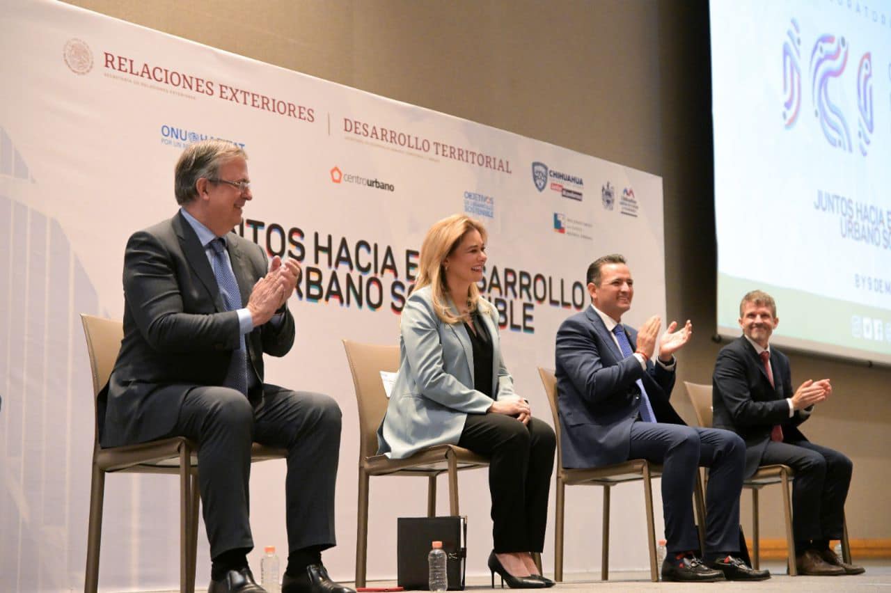 En el acto, que contó con la presencia del secretario de Relaciones Exteriores (SRE) del Gobierno de la República, Marcelo Ebrard Casaubón, la titular del Ejecutivo celebró que Chihuahua sea sede de un evento que impulsa los objetivos de desarrollo sostenible, de la Organización de las Naciones Unidas (ONU).