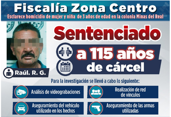 Como resultado de un minucioso trabajo de investigación, la Fiscalía de Distrito Zona Centro logró una pena ejemplar de 115 años de cárcel en contra de Raúl. R. G., responsable del homicidio de una mujer y su nieta, ocurrido en la colonia Real de Minas.