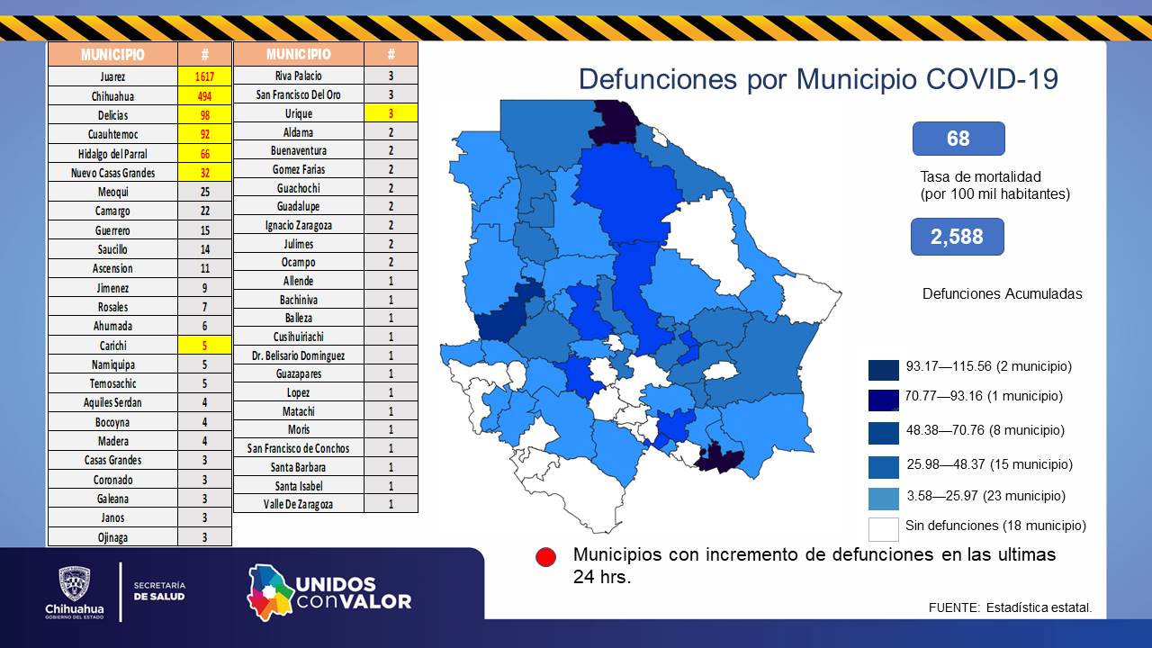 El subdirector médico de la dependencia en la Zona Norte, Arturo Valenzuela Zorrilla, mencionó en la Conferencia Informativa #269 Virtual #229, que los nuevos fallecimientos se registraron: 16 en Juárez, 18 en Chihuahua capital, 3 en Delicias, 1 en Parral, 2 en Cuauhtémoc, 2 en Urique, 1 en Carichí, 1 en Nuevo Casas Grandes.