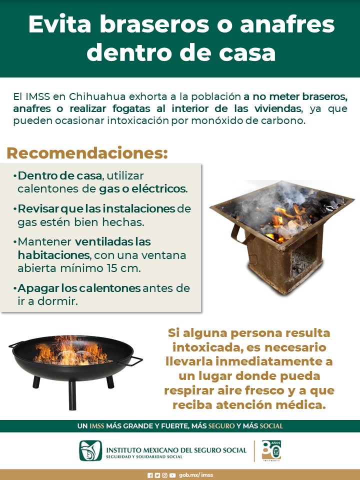 El Instituto Mexicano del Seguro Social (IMSS) en Chihuahua exhorta a la población a no meter braseros, anafres o realizar fogatas en las viviendas, ya que pueden ocasionar accidentes.