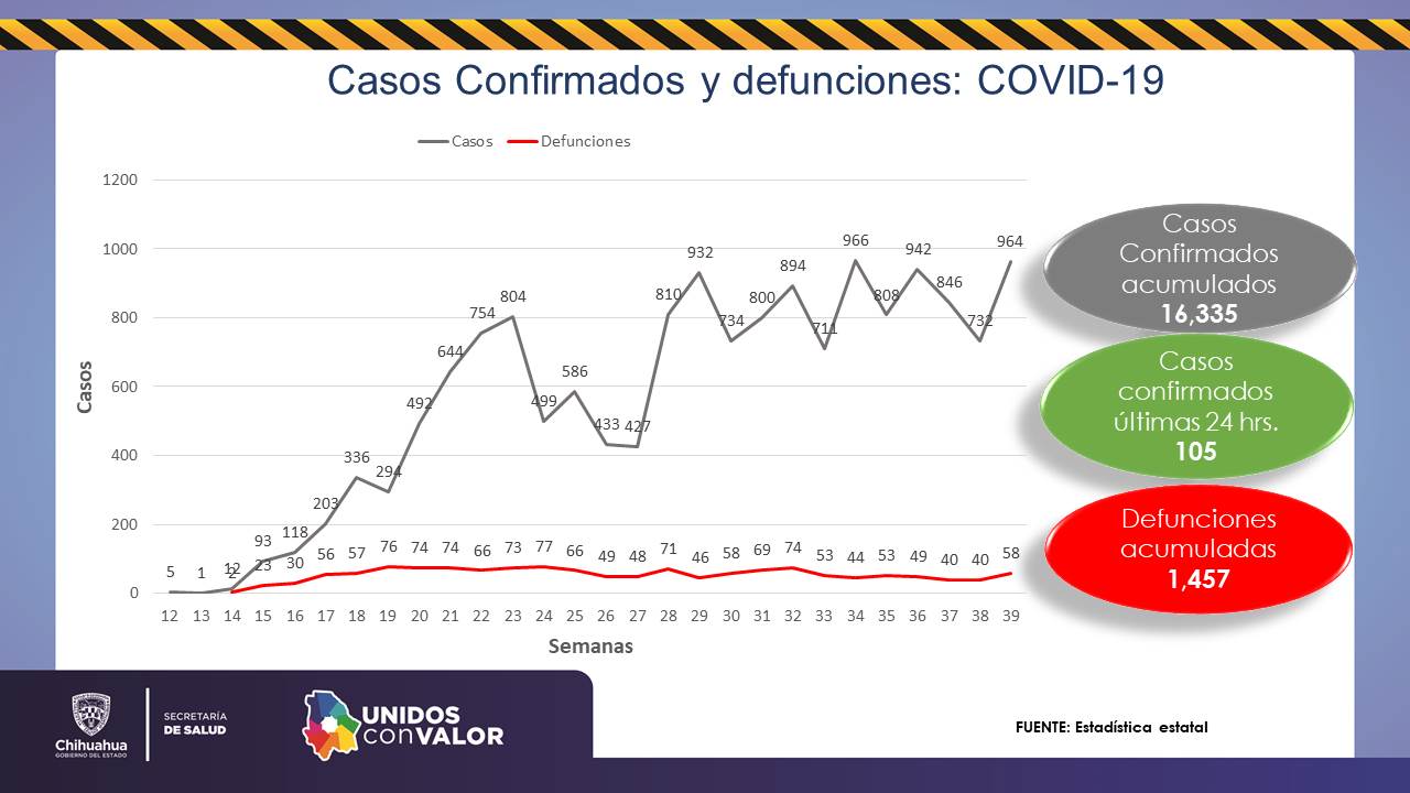 La Secretaría de Salud informó que la semana epidemiológica 39 inicia con un total de 16 mil 325 casos de COVID-19 en el estado de Chihuahua, con 105 nuevos confirmados, así como mil 457 personas fallecidas.
