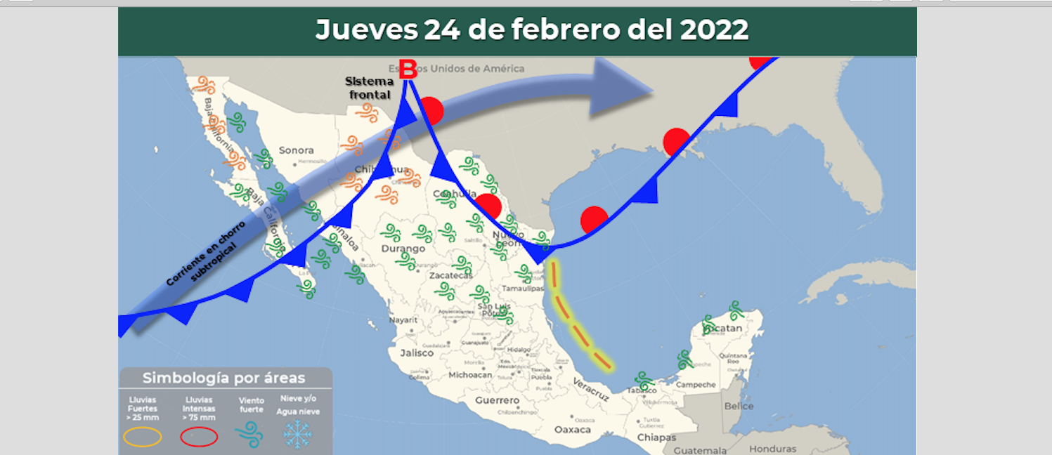 Estas condiciones son generadas por un nuevo frente frío que ingresa al país por el Océano Pacífico en territorio de Baja California y Sonora, mientras que otro frente frío hace lo propio por la frontera de Texas, en un fenómeno climático que puede provocar el incremento la velocidad del viento en el estado.
