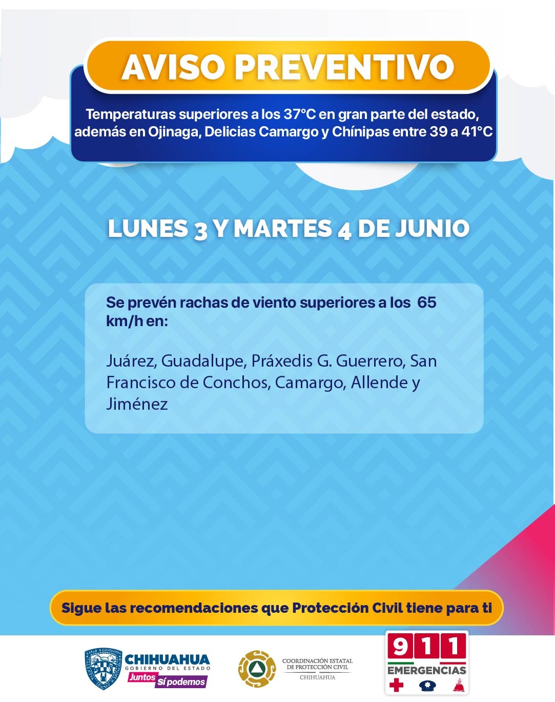 La Coordinación Estatal de Protección Civil (CEPC) dio a conocer que para este lunes 3 y martes 4 de junio, se espera un ambiente muy caluroso y con presencia de vientos moderados en gran parte del estado.