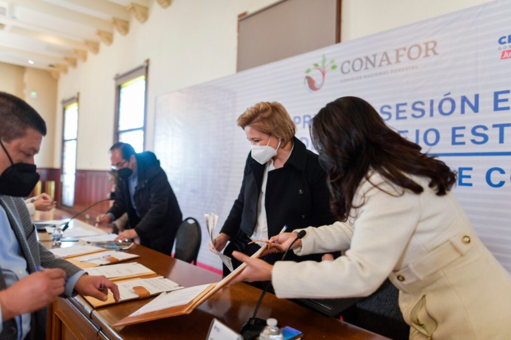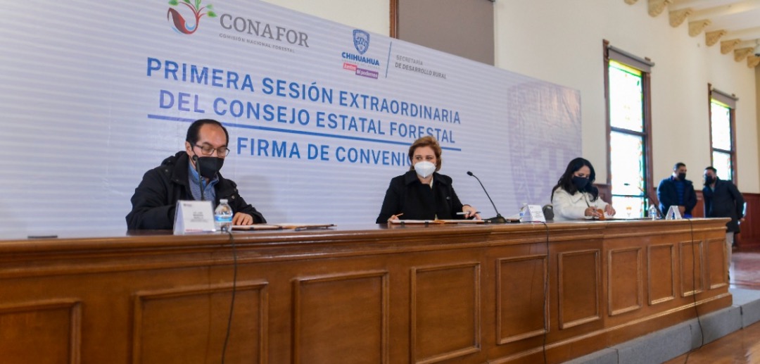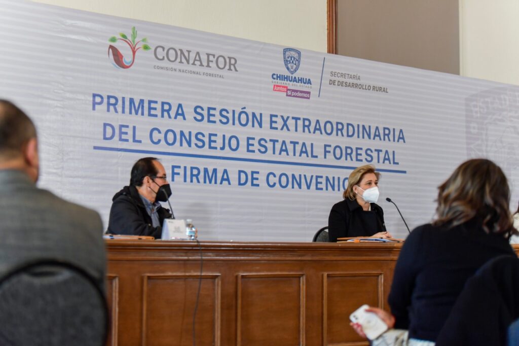 Chihuahua, Chih.-La gobernadora del Estado, Maru Campos Galván, encabezó la primera sesión extraordinaria del Consejo Estatal Forestal en la que se recibió al director de la Comisión Nacional Forestal (CONAFOR), Luis Meneses Murillo, con el fin de firmar un convenio de colaboración entre el Gobierno del Estado y la CONAFOR para la preservación, restauración e impulso de las actividades productiva en materia forestal en el territorio chihuahuense.