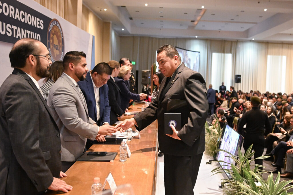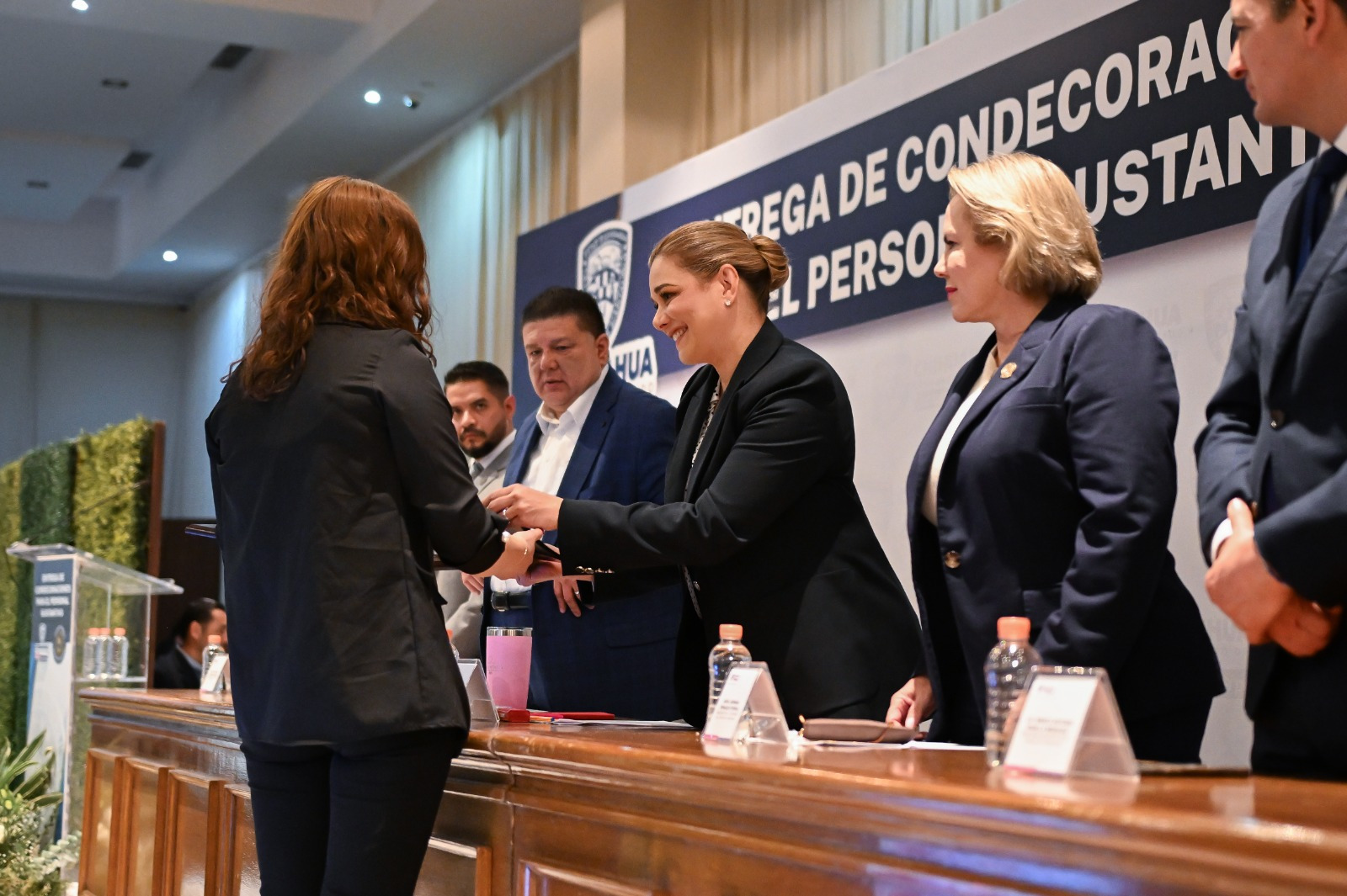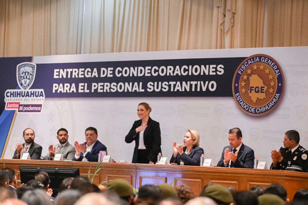 La gobernadora Maru Campos encabezó la entrega de 129 condecoraciones y estímulos a personal sustantivo de la Fiscalía General del Estado (FGE), por los méritos obtenidos y los años de servicio en la dependencia.