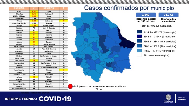 Los municipios que registraron alza en el número de casos son Chihuahua con 66, Juárez con 17, Parral 11, Delicias 5, Ojinaga 4, Santa Bárbara 3; Julimes, Guerrero, Bocoyna y Meoqui con 2 cada uno, y con un solo caso resultaron Matamoros, Jiménez, Morelos, Saucillo y Aldama.