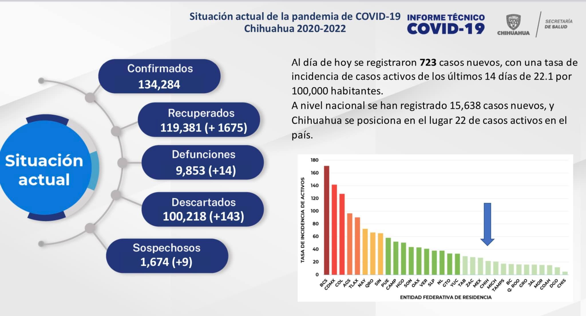 A nivel nacional se registraron 15 mil 638 casos nuevos y el estado de Chihuahua se posiciona en el lugar 22 de casos activos en el país, por lo que presenta una tasa de incidencia de casos activos de los últimos 14 días de 22.1 por cada 100 mil habitantes.