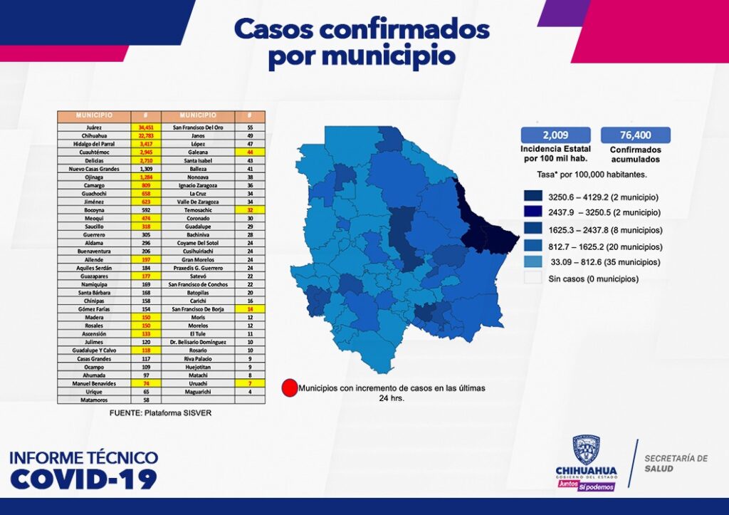 Los 90 casos confirmados se encuentran en los municipios de Juárez, Chihuahua, Hidalgo del Parral, Cuauhtémoc, Delicias, Ojinaga, Camargo, Guachochi, Jiménez, Meoqui, Saucillo, Allende, Guazapares, Madera, Rosales, Ascensión, Guadalupe y Calvo, Manuel Benavides, Galeana, Temósachic, San Francisco de Borja y Uruachi.